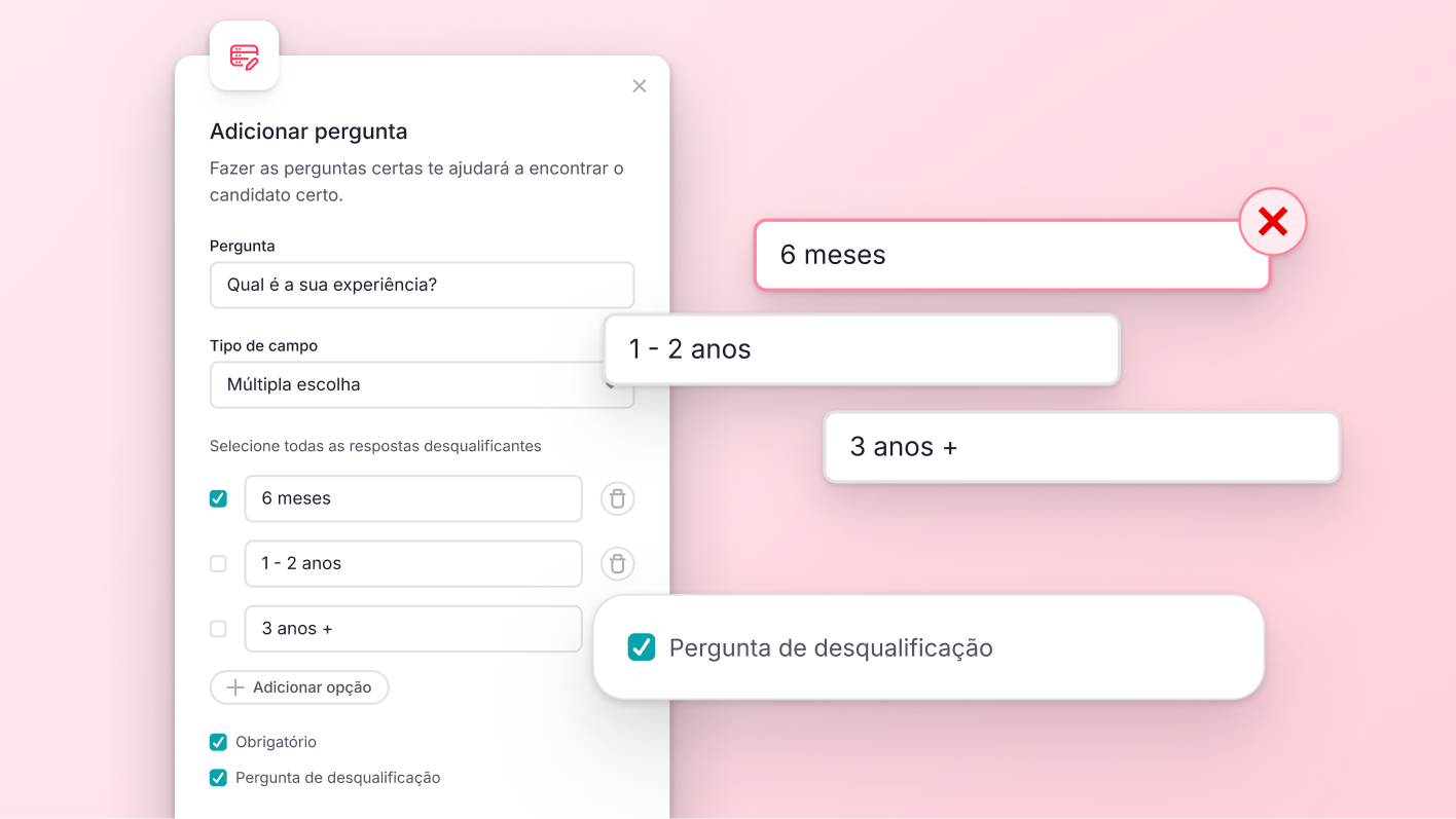 Defina respostas eliminatórias nas perguntas de triagem, tanto de múltipla escolha quanto de escolha única. Candidatos que não atendem aos requisitos obrigatórios são filtrados automaticamente, economizando tempo em cada contratação.